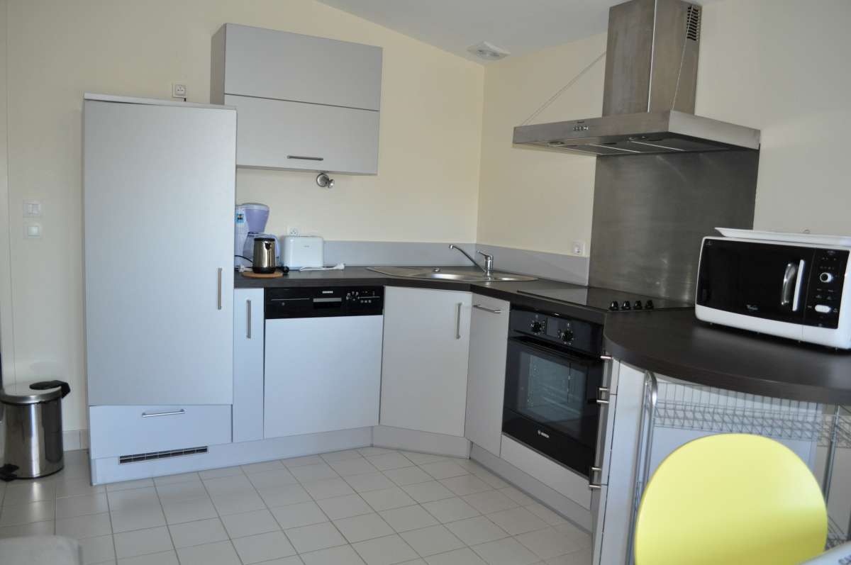 Appartement comprenant une cuisine équipée avec, entre autres, un micro-ondes, un four, une hotte, une plaque vitro-céramique, un lave-vaisselle, un réfrigérateur-congélateur, un salon avec téléviseur, un canapé convertible, une chambre avec un lit de 140, salle d’eau avec vasque, douche et lave-linge.