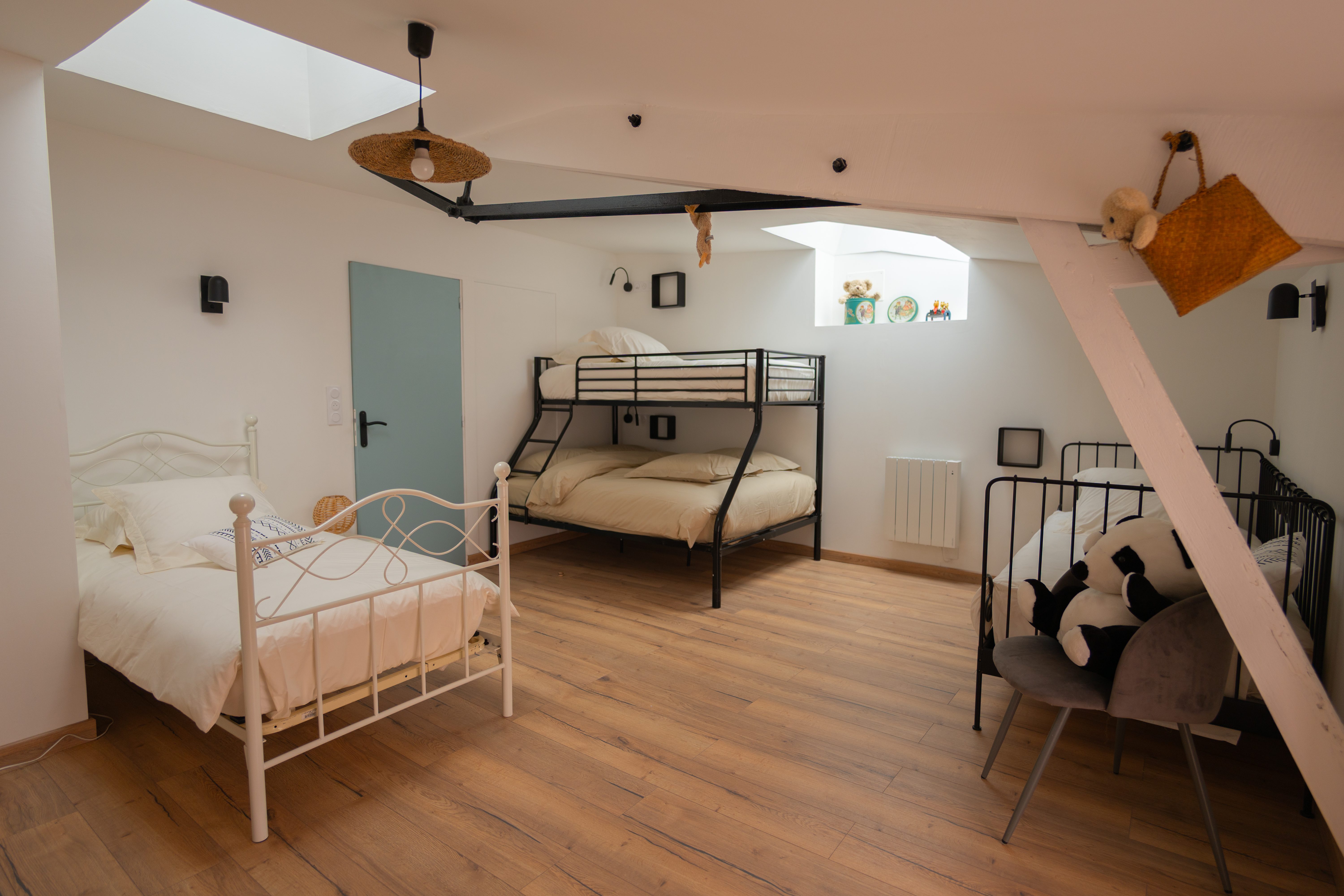 À l’étage : Une chambre parentale spacieuse offrant un grand confort, avec sa salle de bain privative et des WC séparés. Un dortoir installé dans une vaste chambre baignée de lumière, avec une salle d’eau attenante.