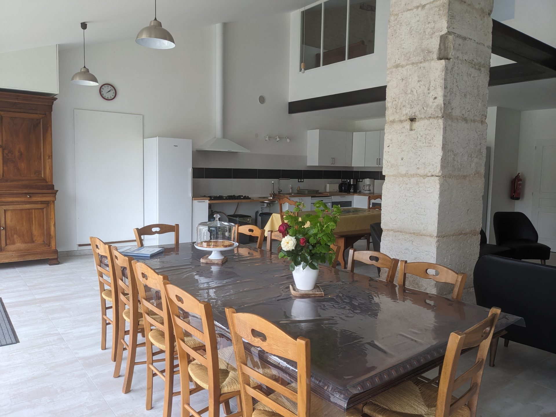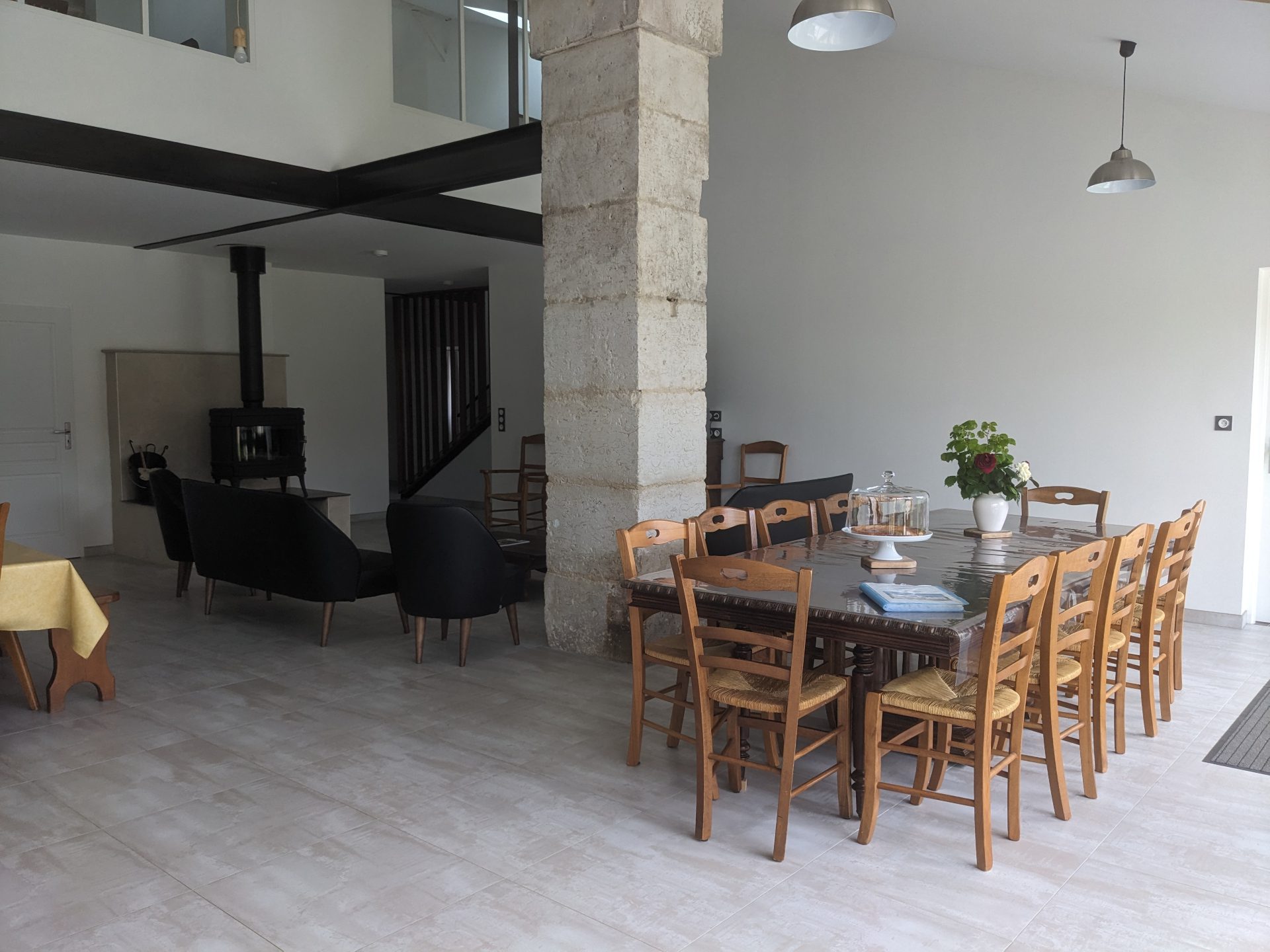 Ce très grand gîte adapté est composé d’une grande pièce à vivre de 65 m², avec poêle à bois, et d’une mezzanine de 55 m².
