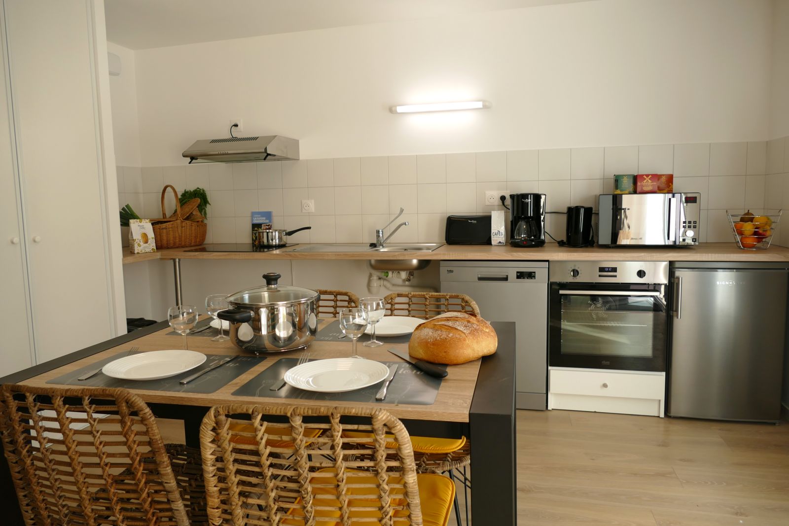 Vous entrez par la cuisine ouverte sur le salon. La cuisine est entièrement équipée.