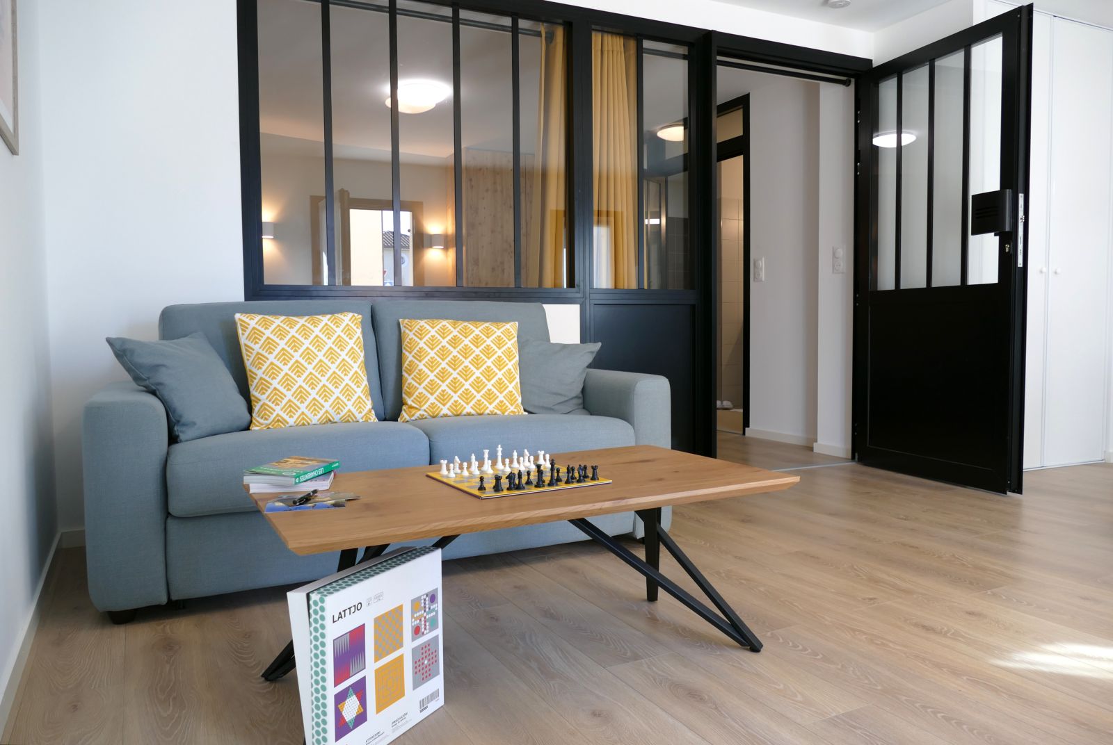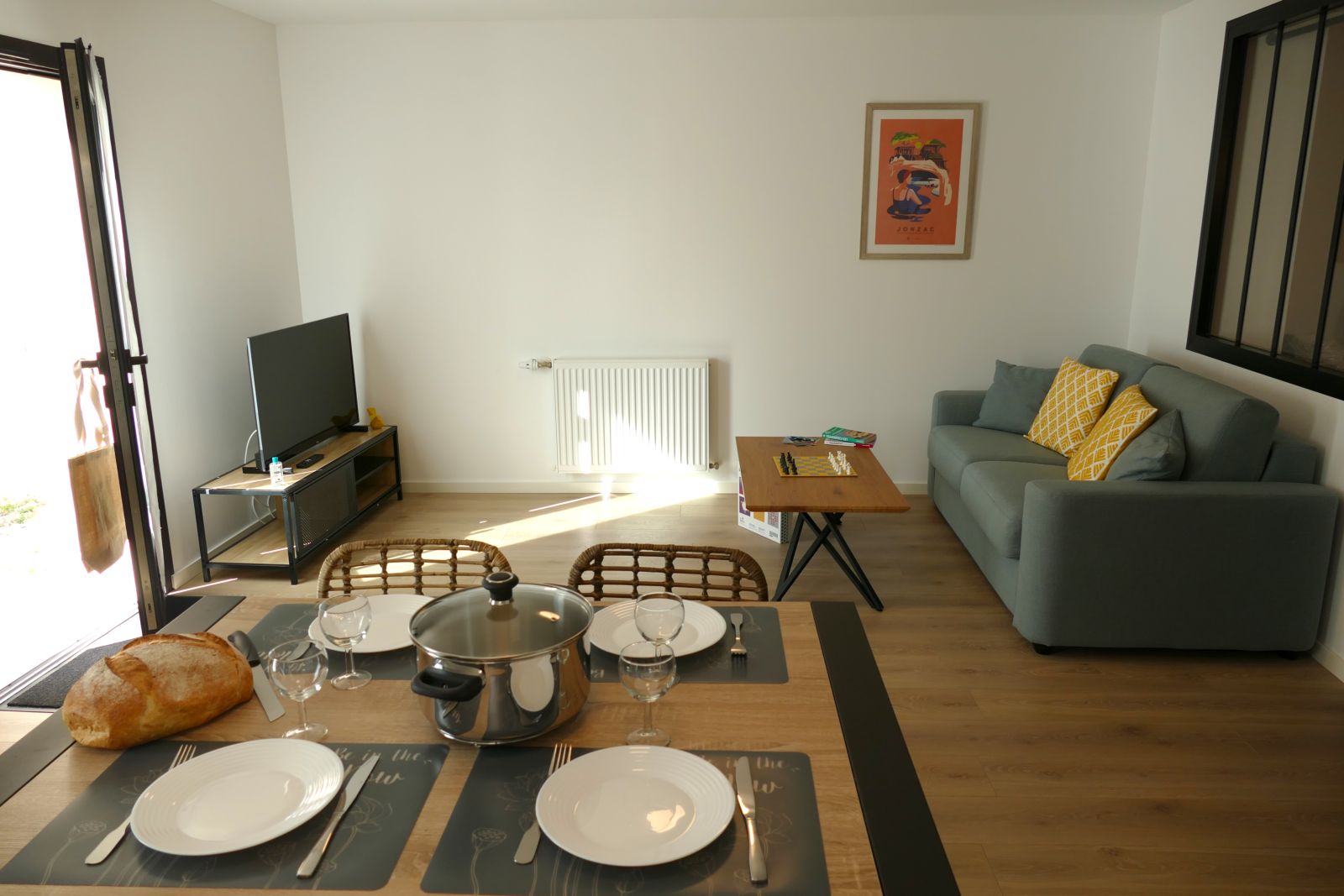 Le salon se compose d’un canapé convertible avec une table basse ainsi qu’un téléviseur à écran plat de 120cm.