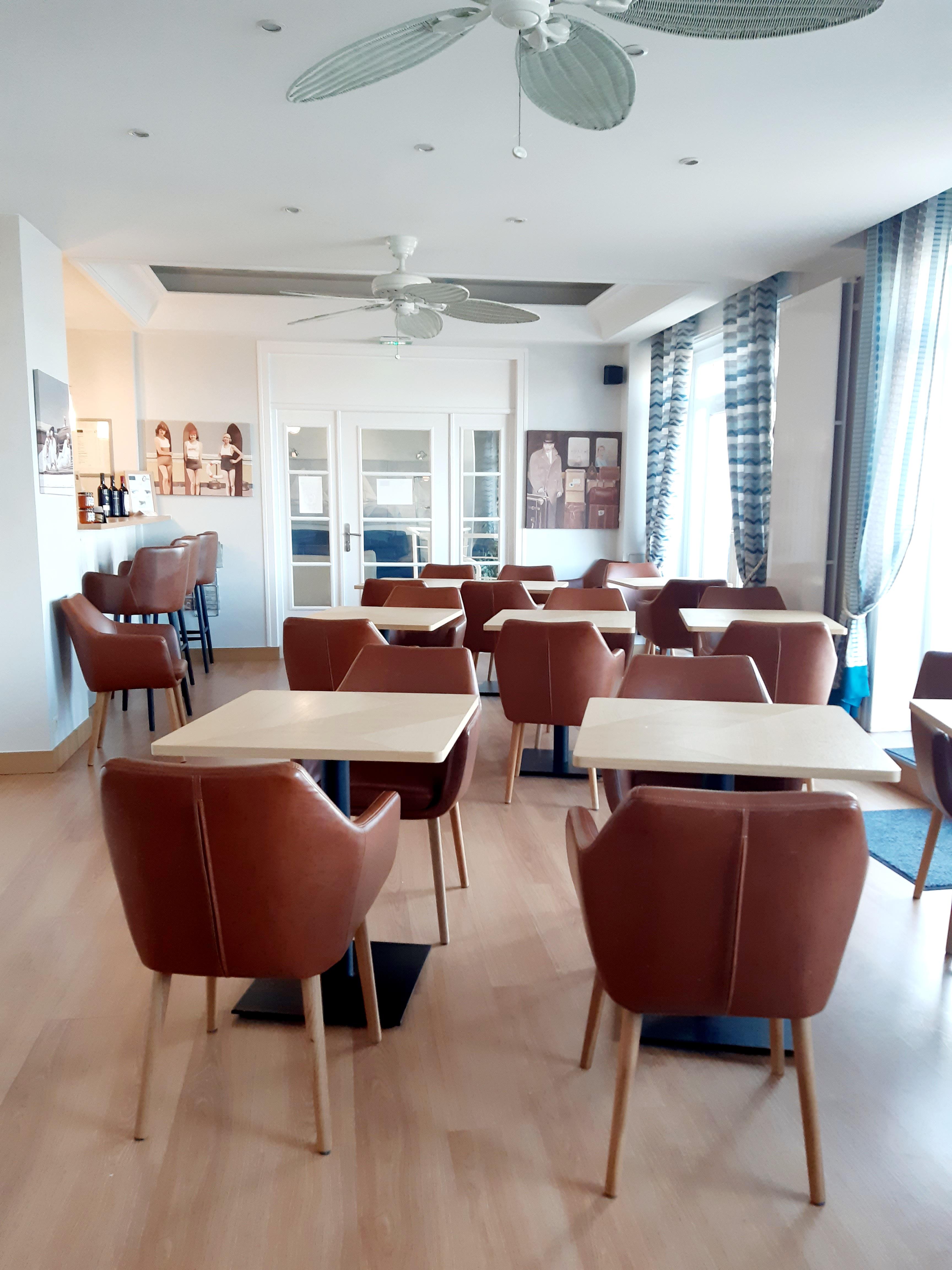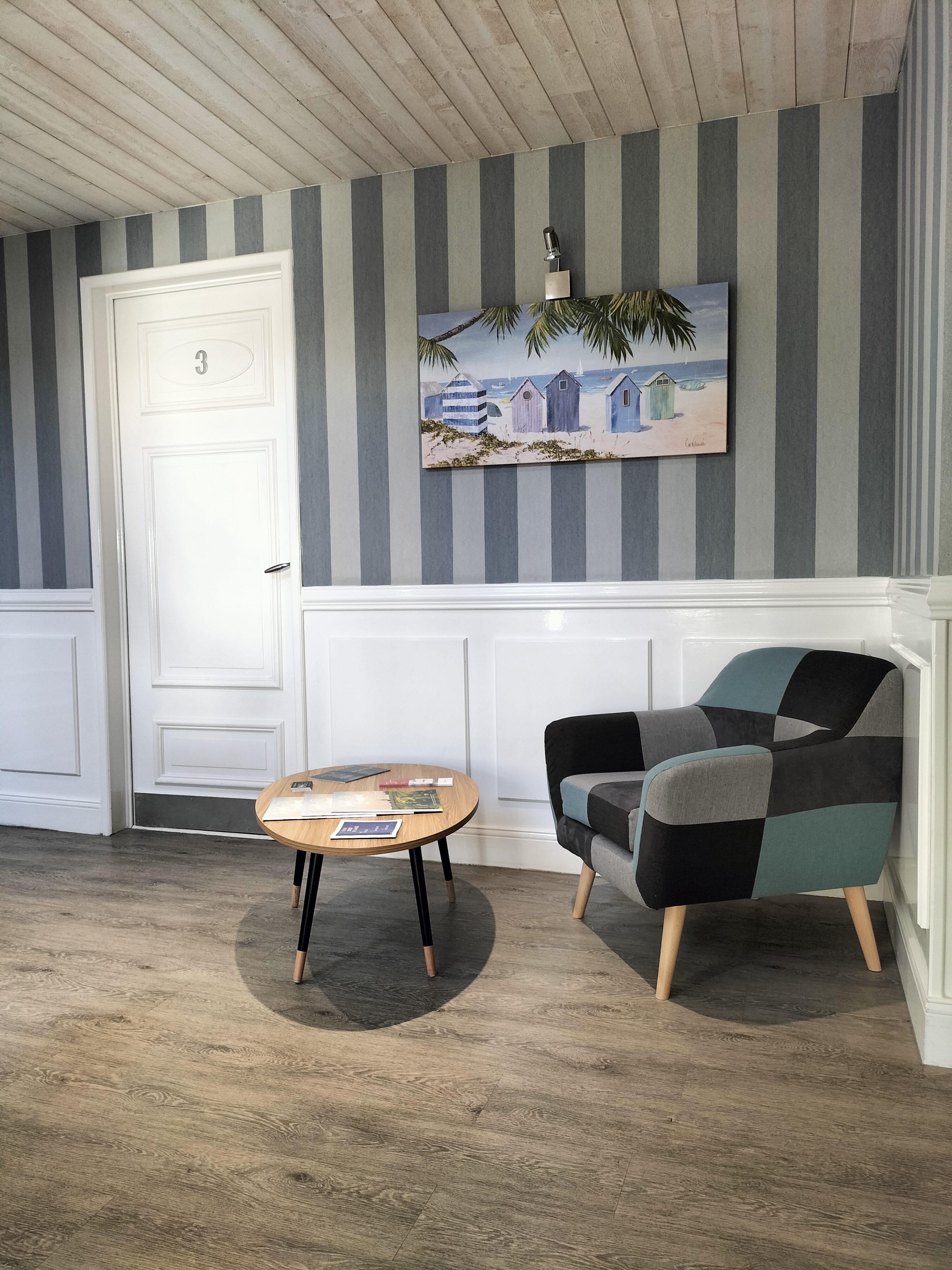 2 chambres pour personnes à mobilité réduite, chambres non fumeurs, salon petits déjeuners, bar avec vue panoramique sur la plage de Pontaillac et le phare de Cordouan.